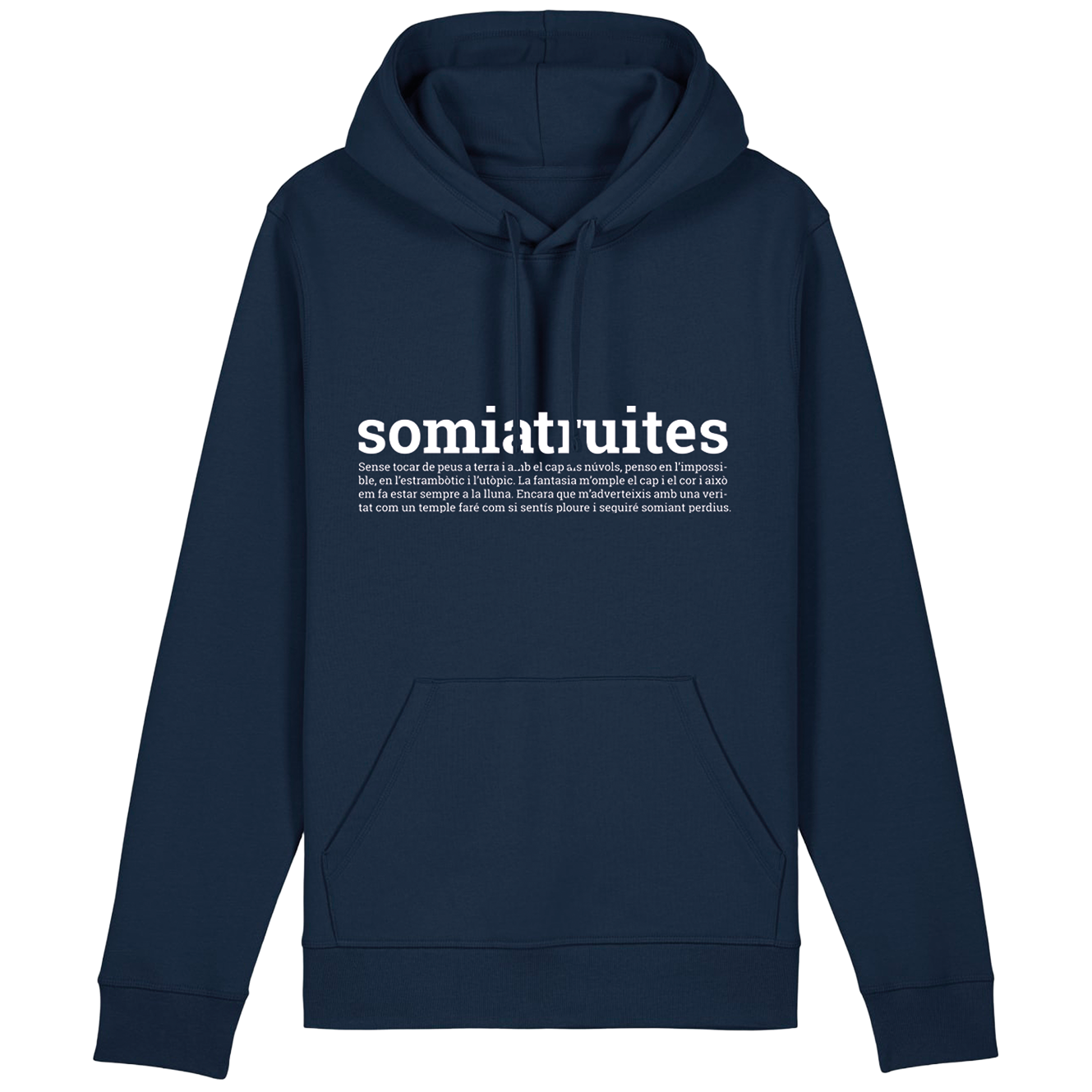 Dessuadora estampada amb la dita catalana Somiatruites i la descripció del seu significat amb les nostres paraules: "Sense tocar de peus a terra i amb el cap als núvols, pensa en l’impossible, en l’estrambòtic i l’utòpic. La fantasia li omple el cap i el cor i això el fa estar sempre a la lluna. Encara que l’adverteixis amb una veritat com un temple farà com si sentís ploure i seguirà somiant perdius. "