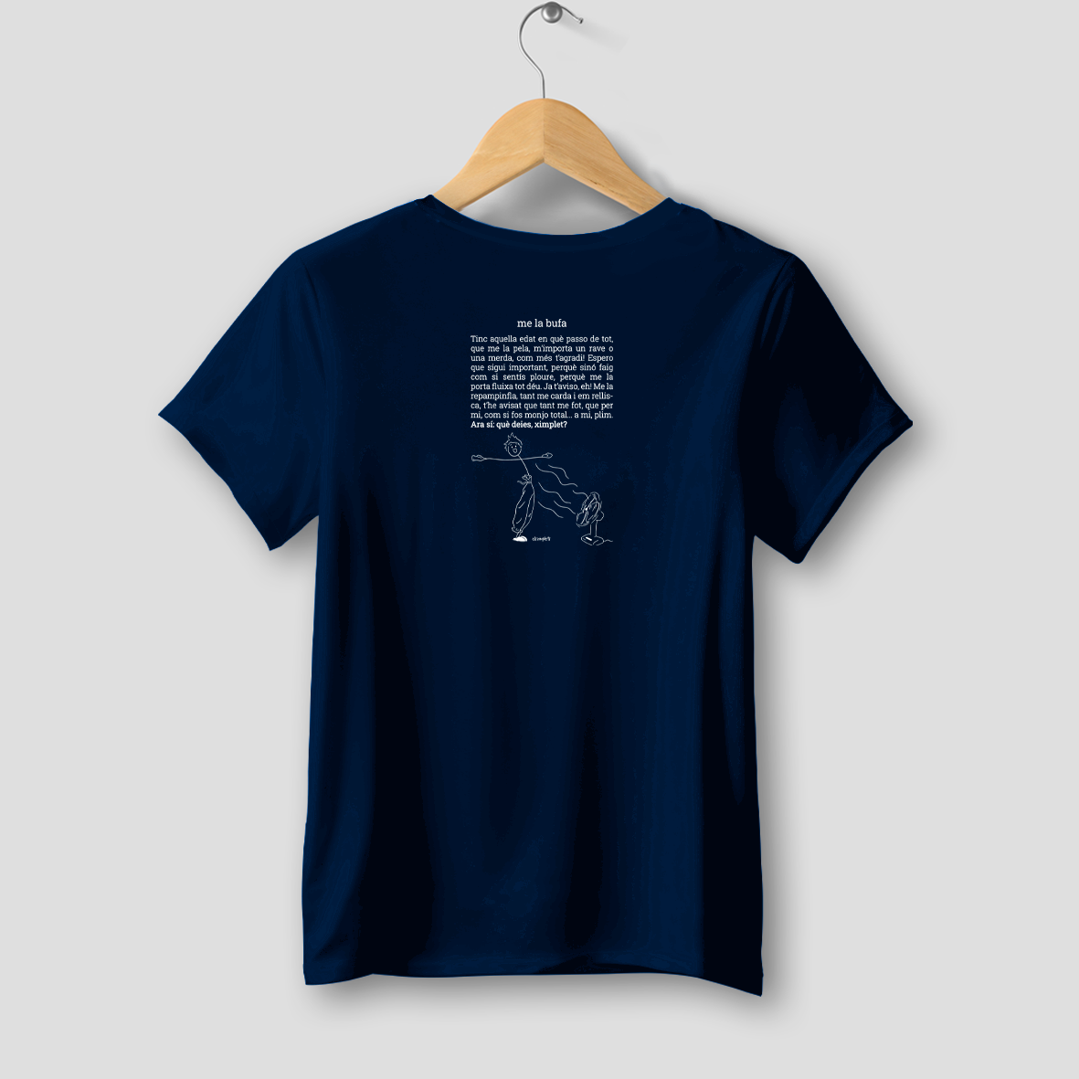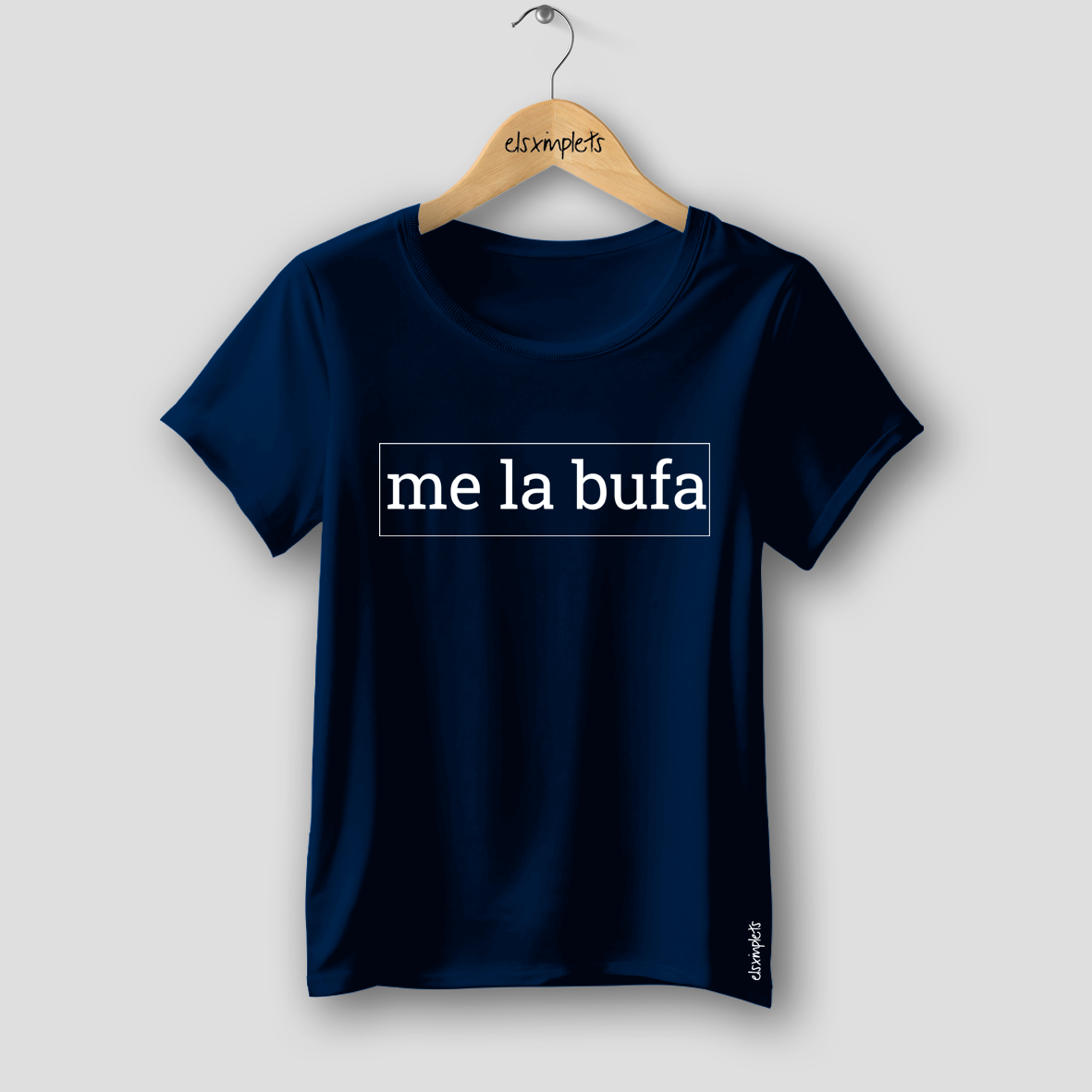 Samarreta de cotó orgànic, estampada amb la dita catalana 'Me la bufa' i la descripció del seu significat amb les nostres paraules.