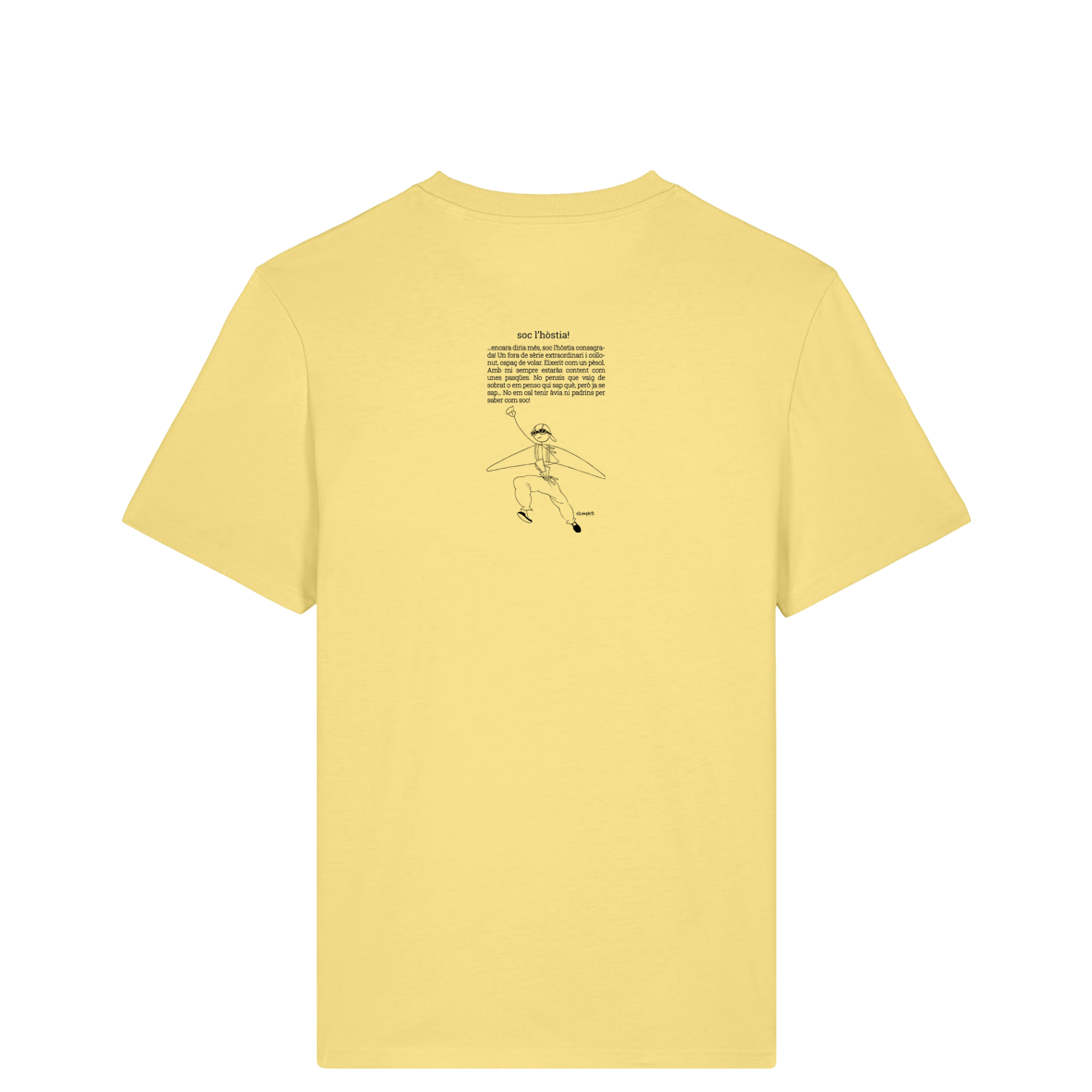 Samarreta de cotó orgànic, estampada amb la dita catalàna Soc l'hòstia i la descripció del seu significat amb les nostres paraules, acompanyat de la il•lustració del ximplet per acabar-ho de deixar clar.